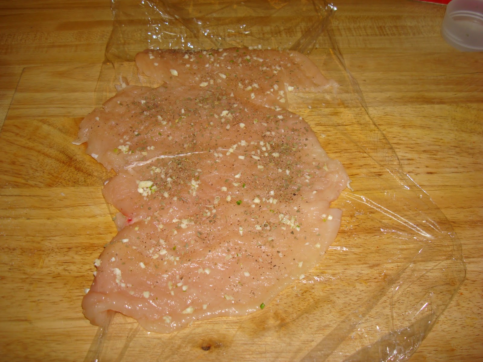 Poner  sobre la mesa las pechugas de pollo abierta sobre plástico alusa y cubrir con lo mismo por encima también. Con una maceta de cocina golpear las pechugas de pollo para extenderla y quede más delgada.
