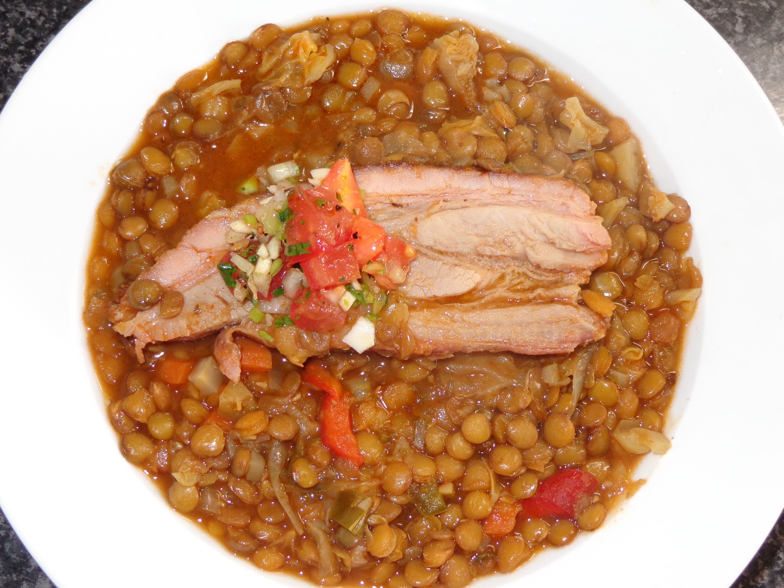 Añadir las lentejas, el perejil caldo o agua con un cubito de pollo o cerdo, repollo, hoja de laurel, salsa de tomate, sal y revolver. El costillar debe quedar cubierto con el líquido. Hacer hervir el líquido, bajar el fuego y cocinar lentamente hasta que las lentejas queden cocinadas.